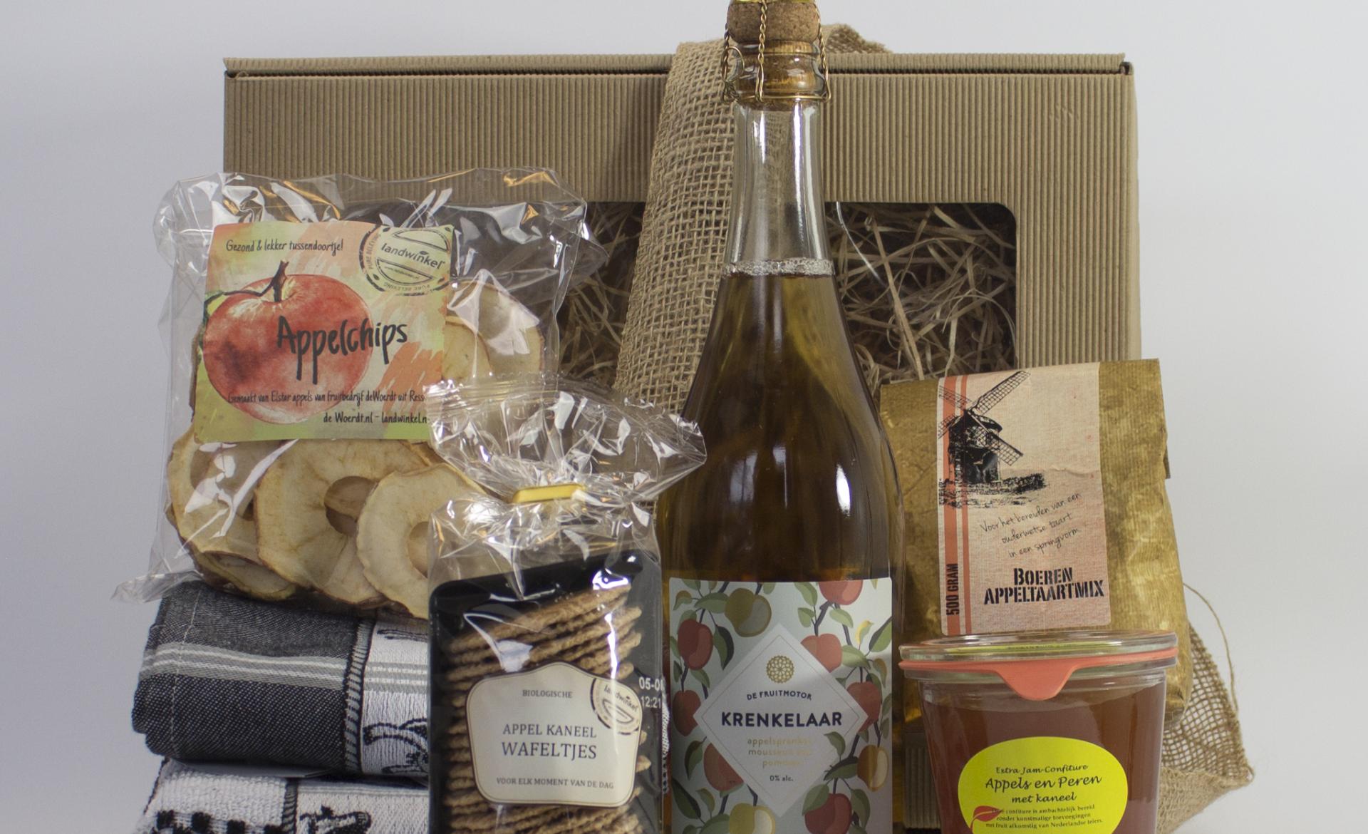 Dit alles wordt verpakt in een mooie houten kist met cellofaan en lint.
