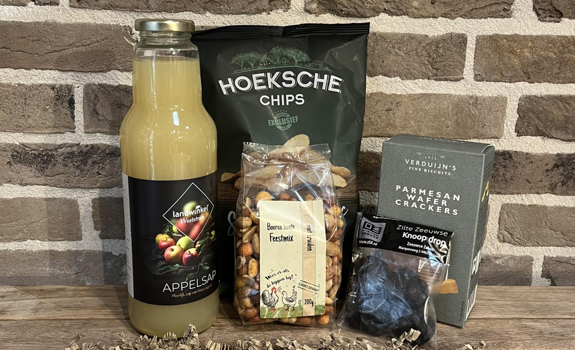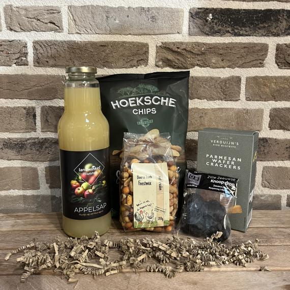 Guusje geniet van al het lekkers van Landwinkel. Zoet en hartig bij elkaar in een pakket. De nootjes, wafeltjes en chips zijn perfect voor op een lekkere borrelplank. Een glaasje pure appelsap maakt iedereen blij!
